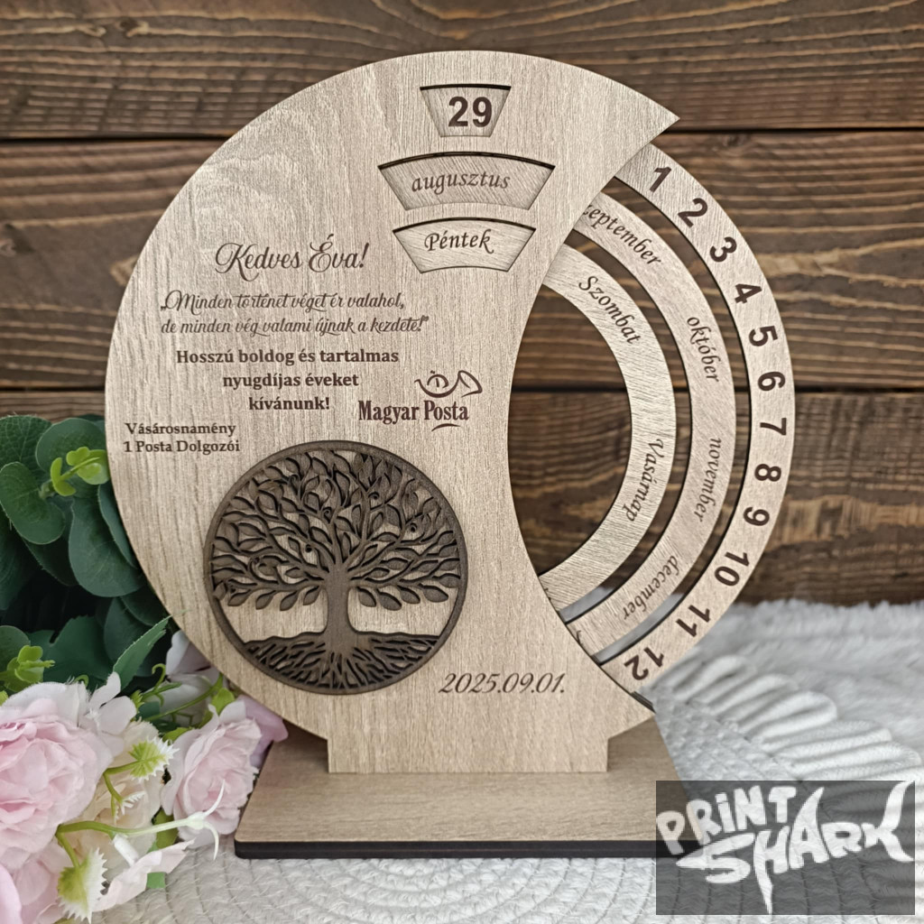 Fa öröknaptár nyugdíjba vonulásra- 3D életfával – egyedi, személyre szabható ajándék. Kérheted névvel, dátummal vagy saját felirattal, hogy igazán személyes legyen. Tökéletes választás ünnepnapra|nyugdíjbavonulásra alkalmakra is. Gyors rendelés, igényes kivitel a Printsharknál!